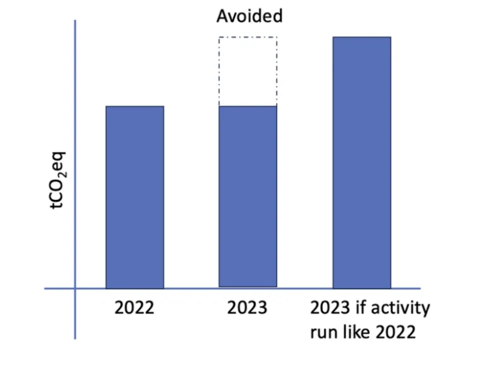 Reduced emissions looks at the reduction of emissions in absolute terms between two scopes. For example, from 2022 to 2023, if you produced 100tCO2eq in 2022 and 80tCO2eq in 2023, you have reduced emissions by 20%.