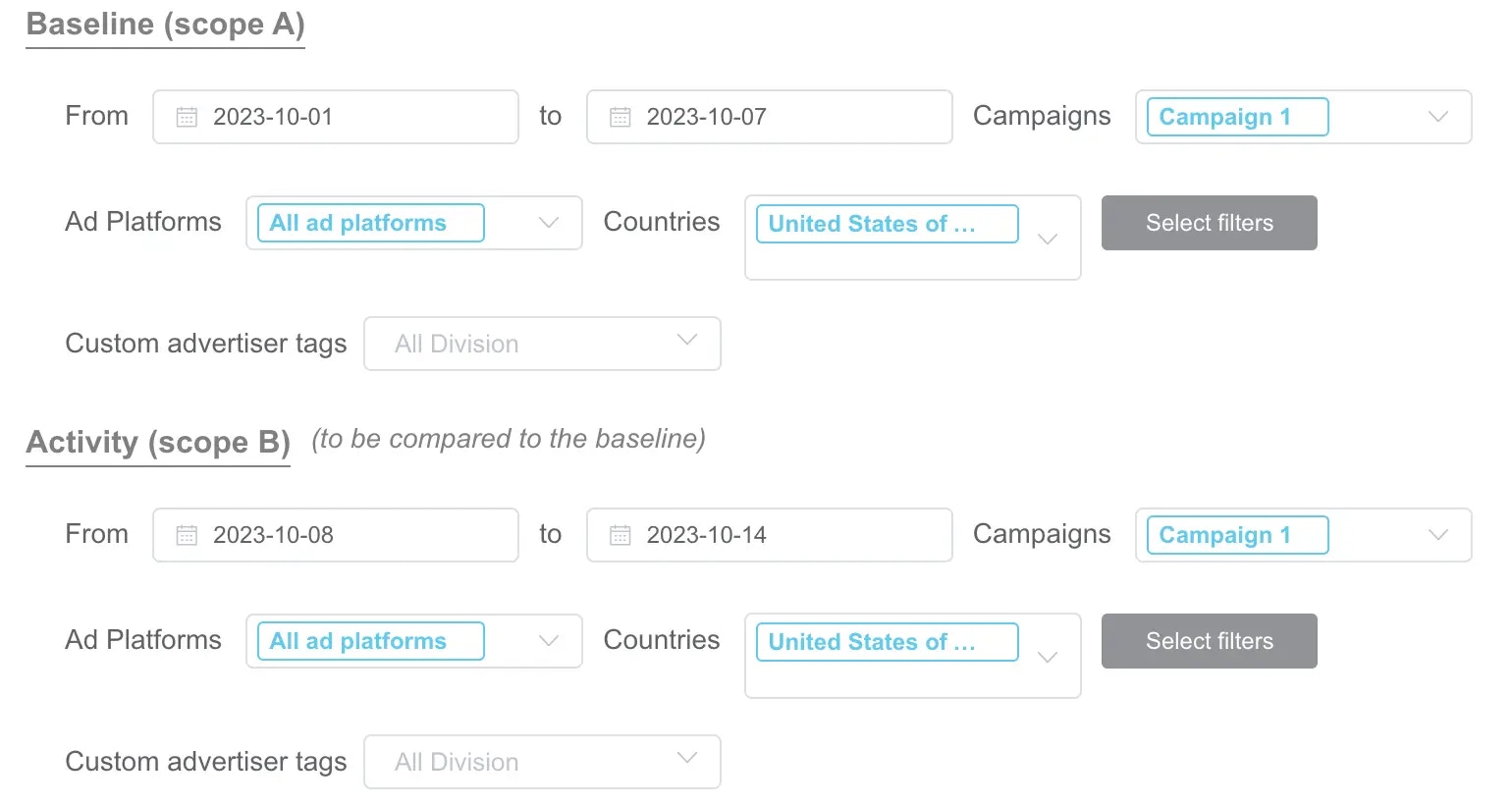 There are 2 broad use cases for reduction evaluation although our tool allows for evaluation of any two scopes to be defined and compared. Reduction:- On a macro level - Looking at one scope vs. a baseline to determine the overall reduction (can be done by brand, country, platform etc)