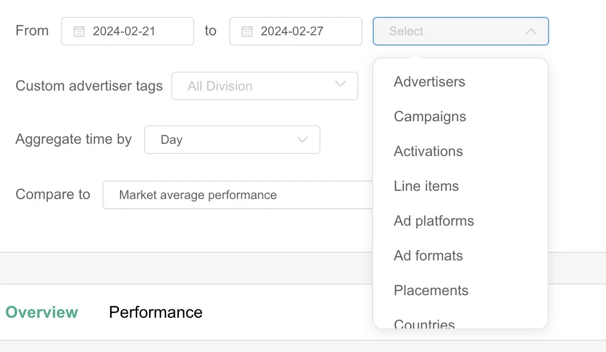 - Sort by determines how you want your results ordered (Impressions, Budget spent, Performance metric)